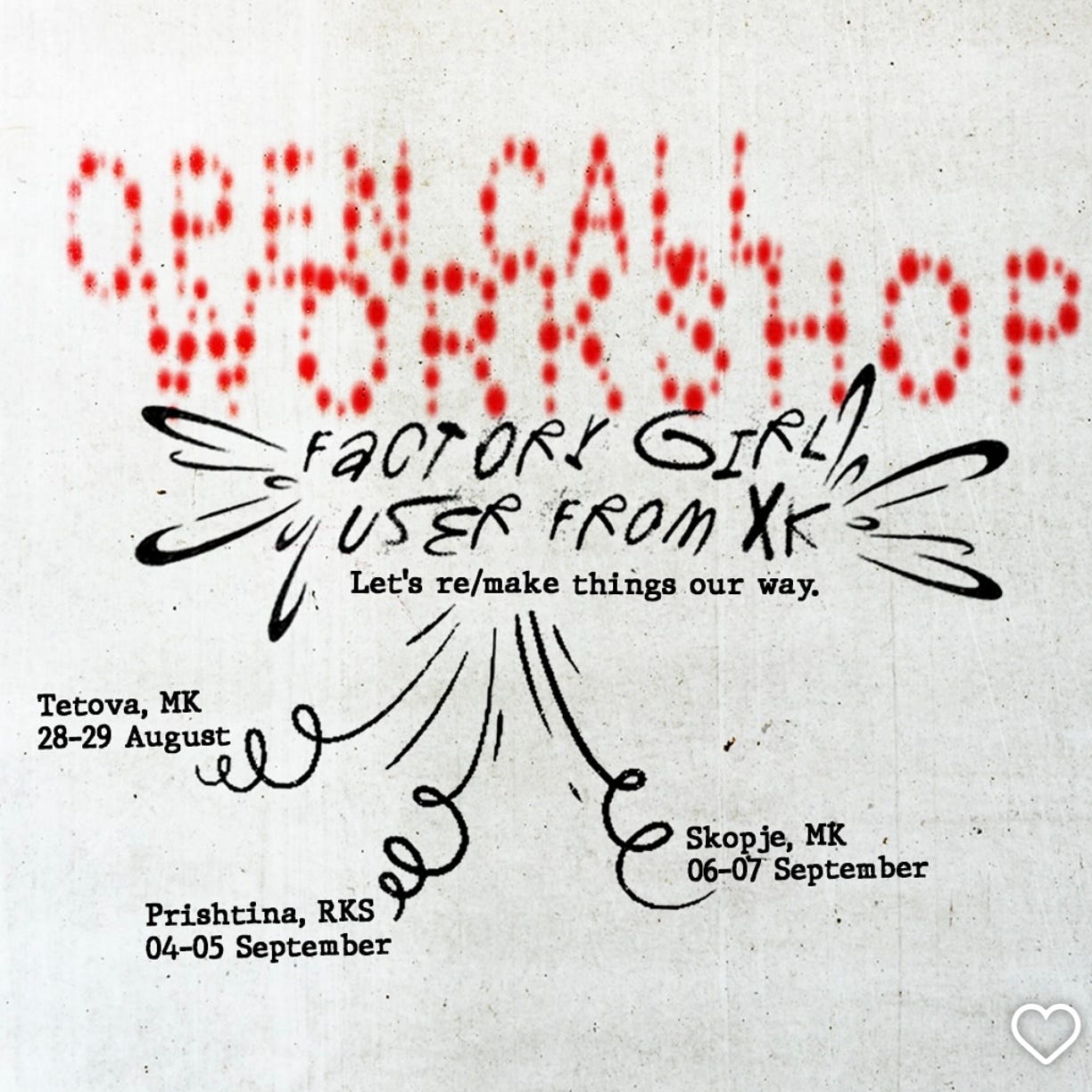 Qe një ftesë e hapun për super punëtori nga shoqja jonë Skytja dhe Studio userfromxk dhe Factory girl. Punëtoria osht për të rinjtë nga Tetova, Prishtina dhe Shkupi me marrë pjesë në një seri workshopesh kreative dhe falas, të dedikume për upcycling – transformimin e veshjeve dhe aksesorëve të vjetër në copa unike, të guximshme dhe me kuptim. Ngjarja e parë mbahet në Tetovë me 28 dhe 29 gusht, masnej në Prishtinë e Shkup. Organizatorët po thojnë se këto punëtori janë për krejt ata që dojnë me shprehë veten, me mësu dhe me eksperimentu, plus nuk kërkohet përvojë e maparshme. Punëtoritë jon për pjesëmarrësit e moshës 18–30 vjeç, dy ditë nga 6 orë për qytet, me materiale të sigurume nga vetë organizatorët dhe pjesëmarrje falas.