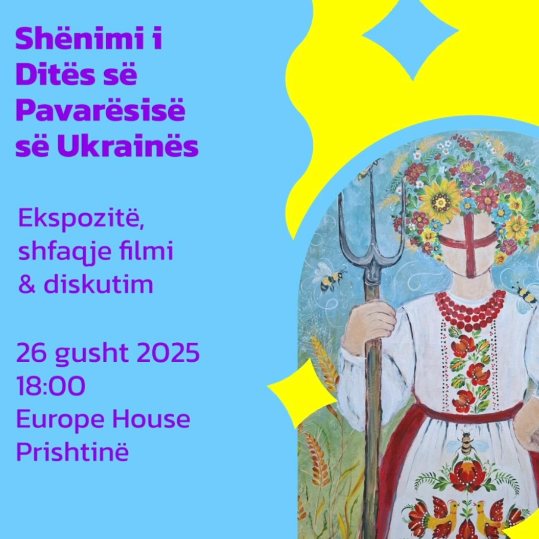 Europe House Kosovo dhe Asociacioni Ukrainas i Kosovës “Bridges of Friendship” ju ftojnë në një mbramje të veçantë të artit, filmit dhe diskutimit rreth Ukrainës, për me shënu Ditën e Pavarësisë së Ukrainës. Ngjarja ka mu mbajt më 26 Gusht 2025, në Europe House Prishtina, prej ora 18:00.