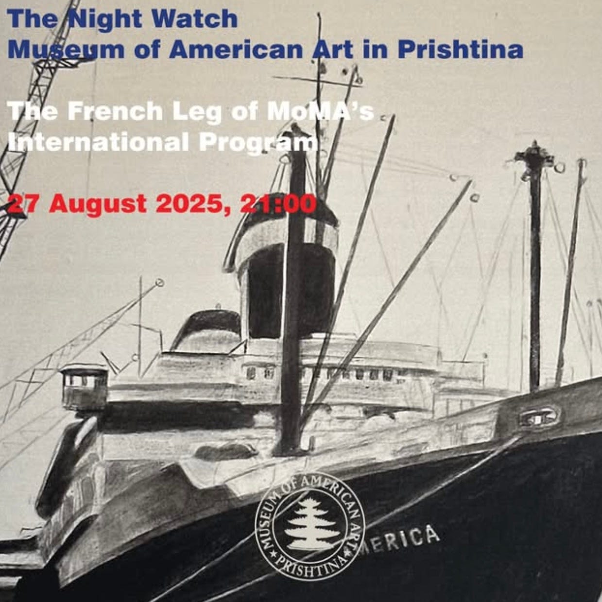 Më 27 gusht, n’ora 21:00, në Prishtina Museum of American Art që operon në kuadër të qendrës së artit Stacion, po organizohet një “natë vigjile me projeksion filmi dhe diskutim mbi trashëgiminë franceze të programit ndërkombëtar të MoMA-s.” Eventi osht i fokusum te ekspozitat që mas Luftës së Dytë Botnore kanë pru në Europë emra si Rothko, O’Keeffe dhe Pollock, tu e ndryshu përgjithmonë peizazhin global të artit modern. Ka m’u shfaqë filmi arkivor Expositions de Paris – 50 years of art in the United States (1955), i shoqnum me një hymje historike mbi lidhjet mes Parisit dhe vizionit të hershëm të muzeut të famshëm MoMA. Super event për artistë, studiues dhe dashamirë të artit me mësu për mënyrën qysh modernizmi amerikan u eksportu dhe u prit në Europë.