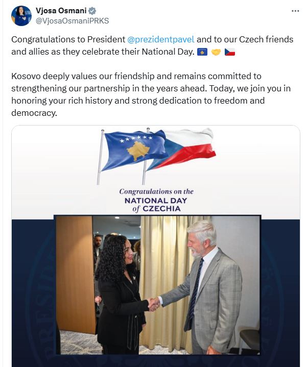 Ky mesazh nënvizon angazhimin e Kosovës për thellimin e marrëdhënieve të saj me Çekinë dhe për forcimin e bashkëpunimit në fusha të ndryshme./RTK/Katror.info