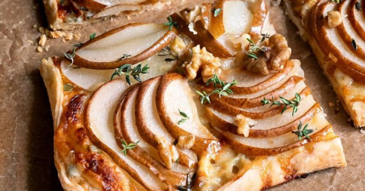 Tartë me dardha, mjaltë dhe djathë gorgonzola